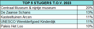 Er zijn ook verschillen in de groei van bezoekersaantallen per type museum vastgesteld. Musea gericht op geschiedenis of natuurlijke historie zagen de bezoekersaantallen met meer dan 10% toenemen in 2024. Musea gericht op de categorieën kunst en bedrijf & techniek lieten juist een daling zien. Ook is bij een nadere analyse geconstateerd dat de musea en erfgoedlocaties in Amsterdam op minder bezoeken konden rekenen (-4%), terwijl buiten Amsterdam de bezoekersaantallen juist groeiden. Dat beeld bevestigd onderstaande tabel met de top 5 stijgers in 2024.